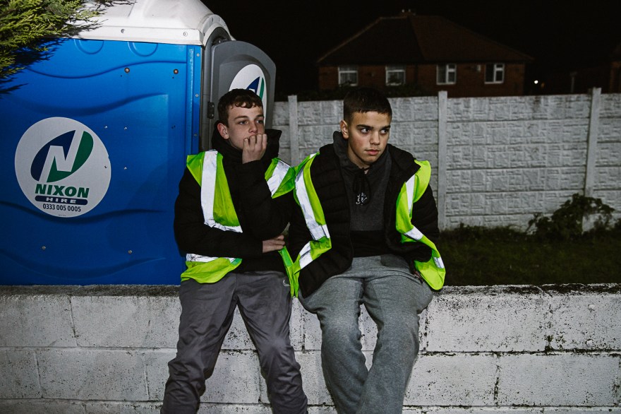 The final image is one of my favourite images from my project to date. Again this is a constructed photograph as a result of my intervention of asking these two boys if I could take their photograph. They are watching the players warm up before the match however that isn’t clear because the photograph lacks the indexical elements to tell that story. What the boys are observing could be anything which adds to the interest of the image and is outside of my usual approach because I am only telling part of the story. I feel this is a dangerous line to take with my work as a story without an ending can be unsatisfying. However I feel that the subjects within the image contain enough interest to carry the story. Two teenage boys, high visibility vests which would infer a reason for being there, grey tracksuit bottoms which are not part of their official regalia however an important piece of ‘street uniform’ within this Northern, British conurbation.