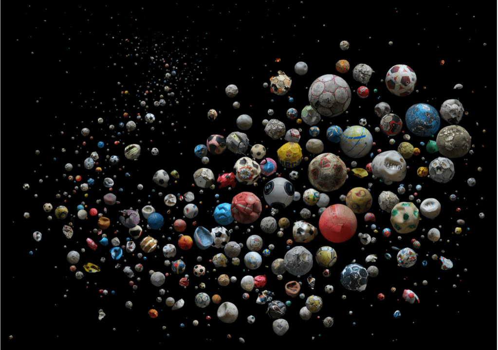 The research methodologies of archiving found objects’ provides authenticity whilst enriching the work by making important statements about the environment. The project ‘Penalty’ could be broadly linked to my football themed project in addition to the climate change briefs. Barker used images of footballs to create montages as seen in the example below.