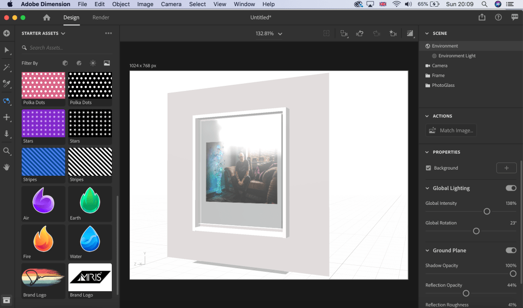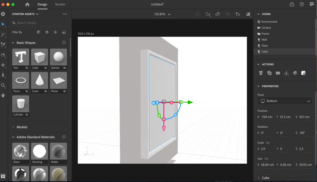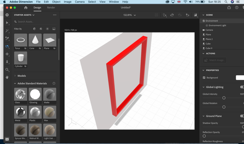 Having been relatively pleased with my first attempt with Adobe Dimension, my broader ambition to produce a digital exhibition needs significant learning if I am to produce something special. Having opened the work space I set about creating a frame. Sounds like a simple task but this was probably the most difficult task as I was still very much learning how to navigate around the workspace. I eventually changed the colour of the frame so that I was able to see clearly what I was working with.