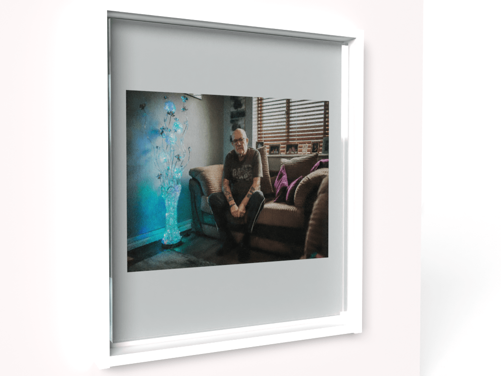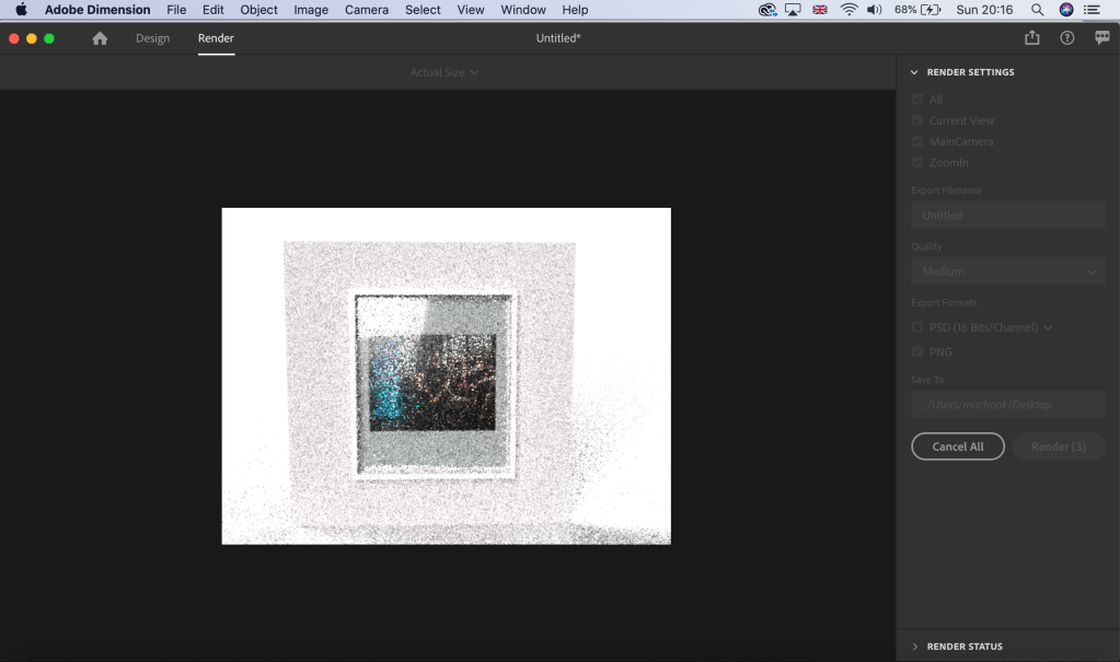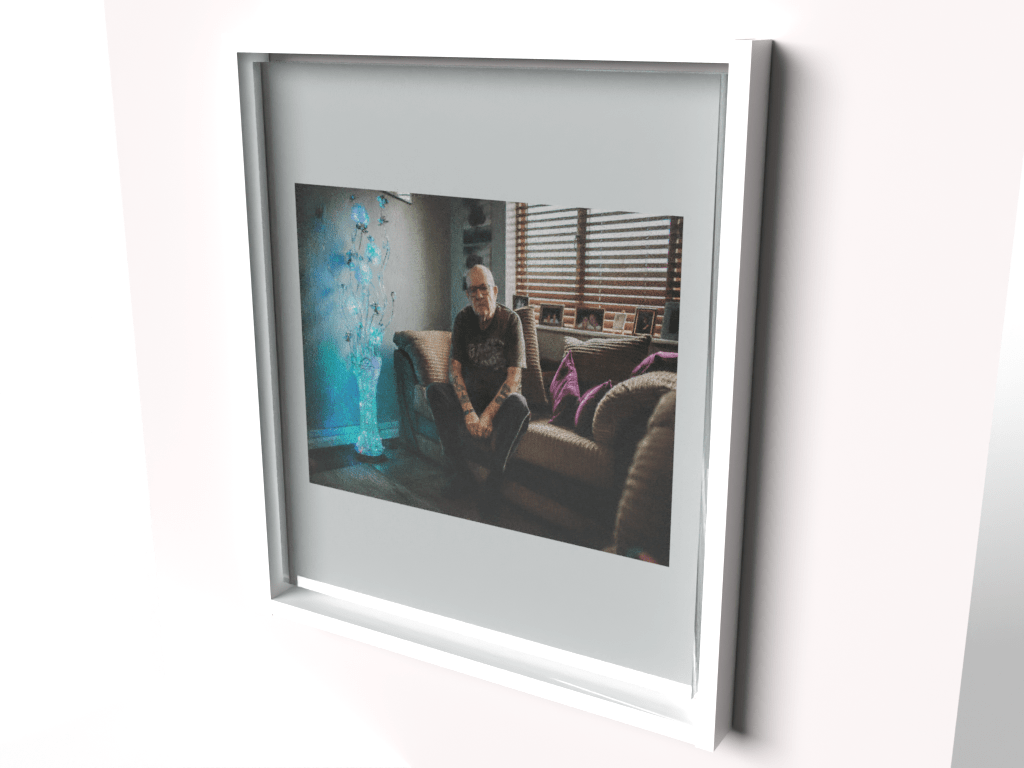 At this point I had a basic model which looked like a photo frame with a photograph inside. I then experimented with lighting environments and I did a number of these which is where the glass texture added an element of realism. Then onto rendering the frame to convert into a PNG image to be further placed into a programme such as photoshop. The process rendering the finished asset took some time and I don’t think my Macbook appreciated having to use all of its power.