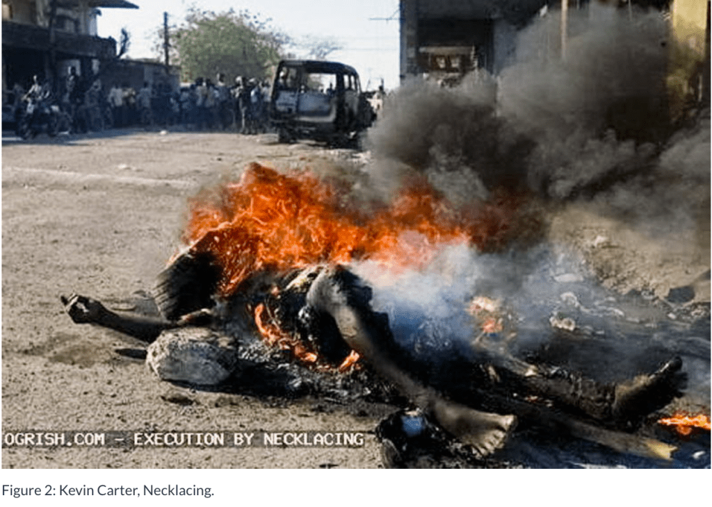 Borge offers an explanation which has merit stating “Maybe activist photography begins at the point that a photographer thinks beyond the photograph, or when the photograph is not the end, rather a means to a solution even if the solution is nebulous.” (Borge 2012). This relates to the photograph taken by Carter in addition to his other work by his intentions to document inequality, poverty and the grotesque rituals carried out in South Africa as part of the Apartheid regime. I feel that understanding the nature and context of his work adds clarity to his voice as a photojournalist. And in viewing ’The Vulture and the Little Girl’ in addition to my basic understanding of his work, I understand that Carter was probably a specialist in the realm of creating art and journalism out of real life horror. The artistic prowess probably the result of repeated experiences of a horrific nature, See Carter’s photograph of the result of ‘Necklacing’ below.