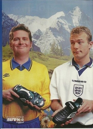 Moving on to the gestures of the subjects we see the subject in yellow addressing the camera directly with an inviting smile which may be more at home in a tourism photograph as opposed to the second subject (Alan Shearer) who is addressing the second subject with a gesture of bemusement which may suggest the player wearing the yellow strip is an imposter. The final element I will discuss is the advertised product which are the football boots. They are shown on either side by each subject to feed the viewers gaze and need for understanding of how the products look in an evidential nature.