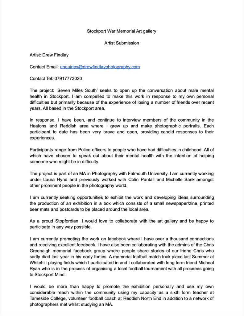 In the pursuit of an exhibition space I have applied to Stockport Art Gallery to hold a local exhibition. In order to do this I wrote a statement in addition to submitting six images from my project. I volunteered to promote the event myself and emphasised the positive response from the community I’d already received.