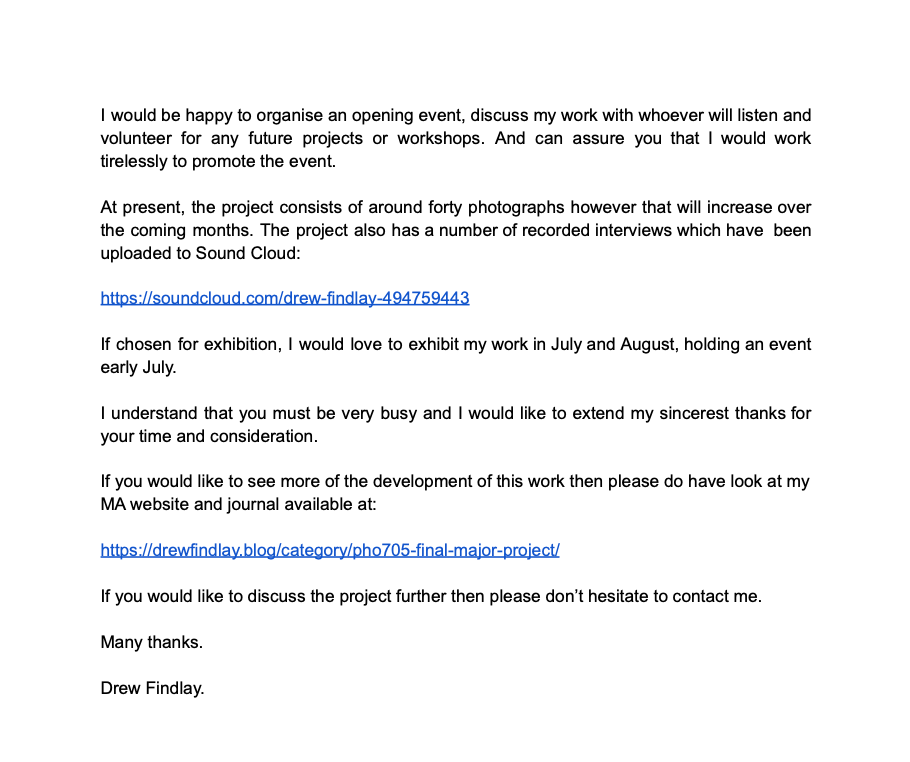 In response to identifying this avenue I quickly put together an email and PDF of work to hopefully gain some support for my project. However I understand that I am late in submitting my work as the festival starts at the beginning of May.