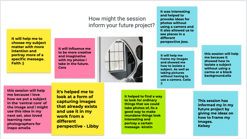 I was aware that the session I had planned was focussed on looking at the digital world of photography. I wasn’t worried by this and I felt that the session was underpinned with justification and intention in addition to drawing on the work of Eggleston and Alex Webb. Therefore I felt I had some historical philosophies in addition to the progressive approach of Jenny Odell. The session itself went very well and students seemed to be engaged and interested as the feedback below would suggest.