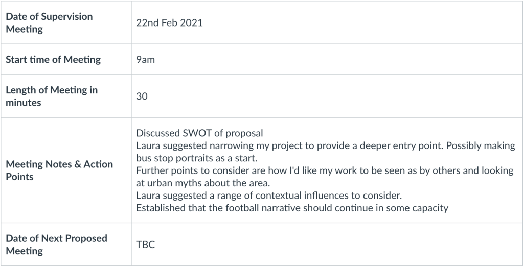 At this stage of the MA I have produced a number of portraits, some of which I like, some I don’t. Some I like but think are a little safe and some I’m not sure about and are unsafe. What I do understand is that my work is developing and becoming stronger, however I am now at the stage where I need to think beyond the portrait and sequence phase and engage with the task of visualising the journey element of the project.