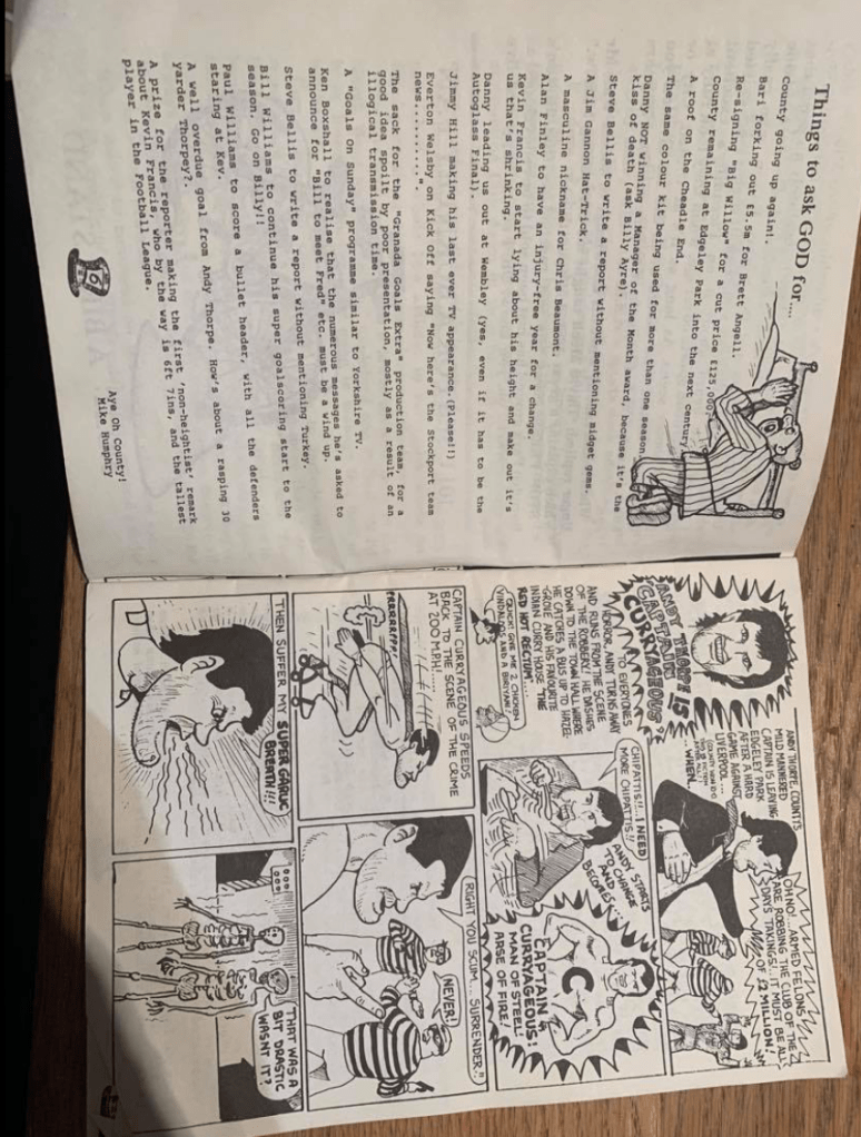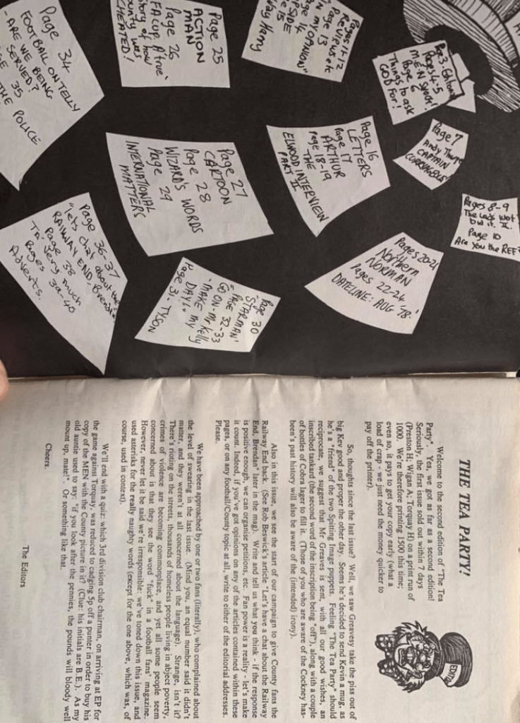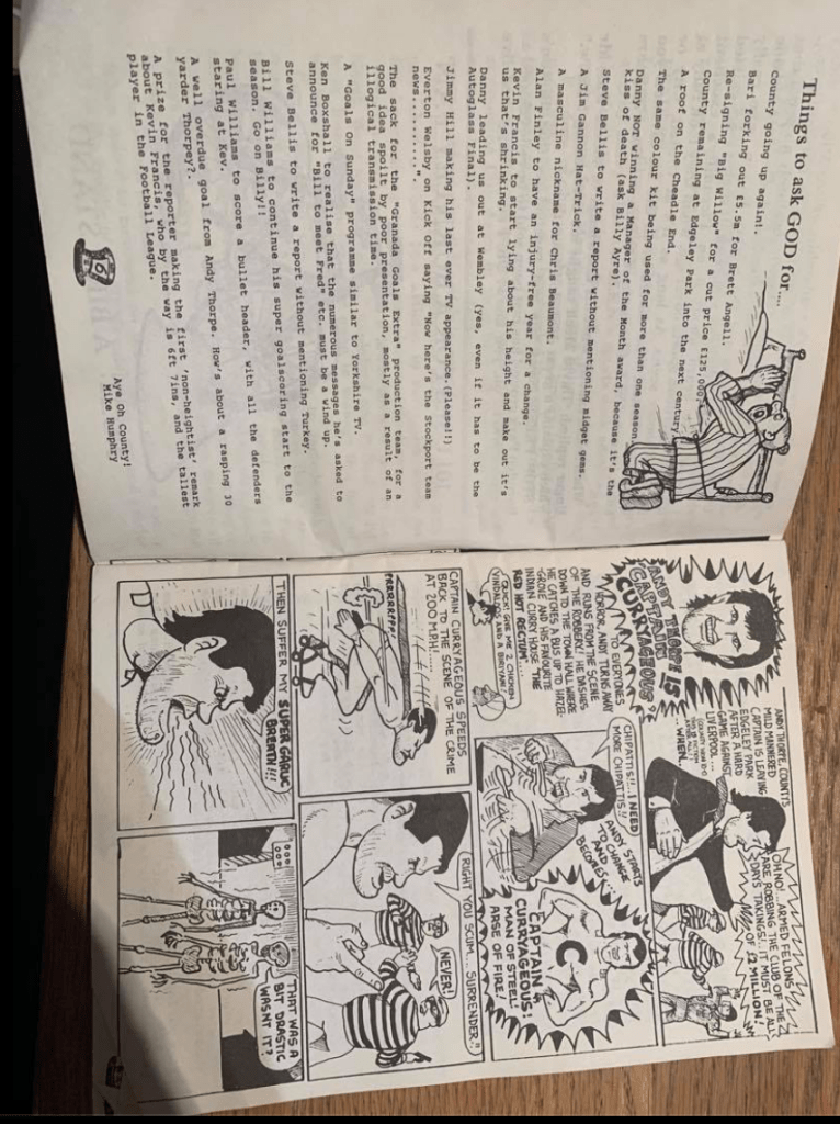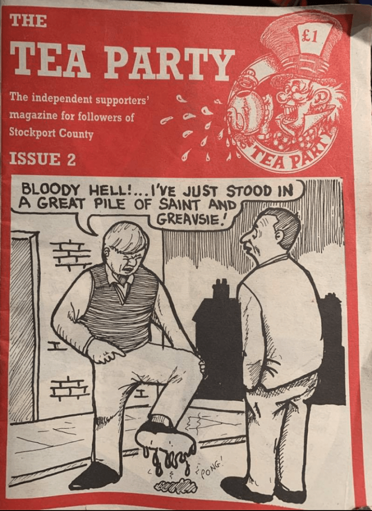 In recent weeks we have been encouraged to start looking at the subject of zines and I was intrigued by them as my most pertinent memory of them is a zine produced in the 1990’s for supporters of Stockport County Football Club. as a small child I have vivd memories of a long haired hippy type middle aged male selling the Tea Party outside the turnstile at home matches. Having done some searching and asking I managed to get hold of a copy in order to find more about the content and the rhetoric that it promoted.