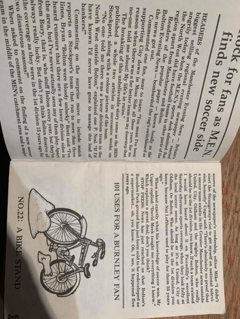On first reflection, the content of the zine is a type of social commentary on issues surrounding the town of Stockport and its football club. To say that this product would raise a few eyebrows in present day is an understatement. The layout itself conforms to many of the hallmarks of a classic, self published zine. Pink in colour with a secondary colour red, the zine appears to be low value in its production values however in terms of the content it is clear that the producers are passionate about the football club. Around 50 pages, the Tea Party is heavy on written content which verbally attacks rival football clubs in addition to the local media such as the Manchester Evening News (MEN) for not having enough content about the club and choosing to focus on the two Manchester football clubs in addition to Bolton Wanderers.