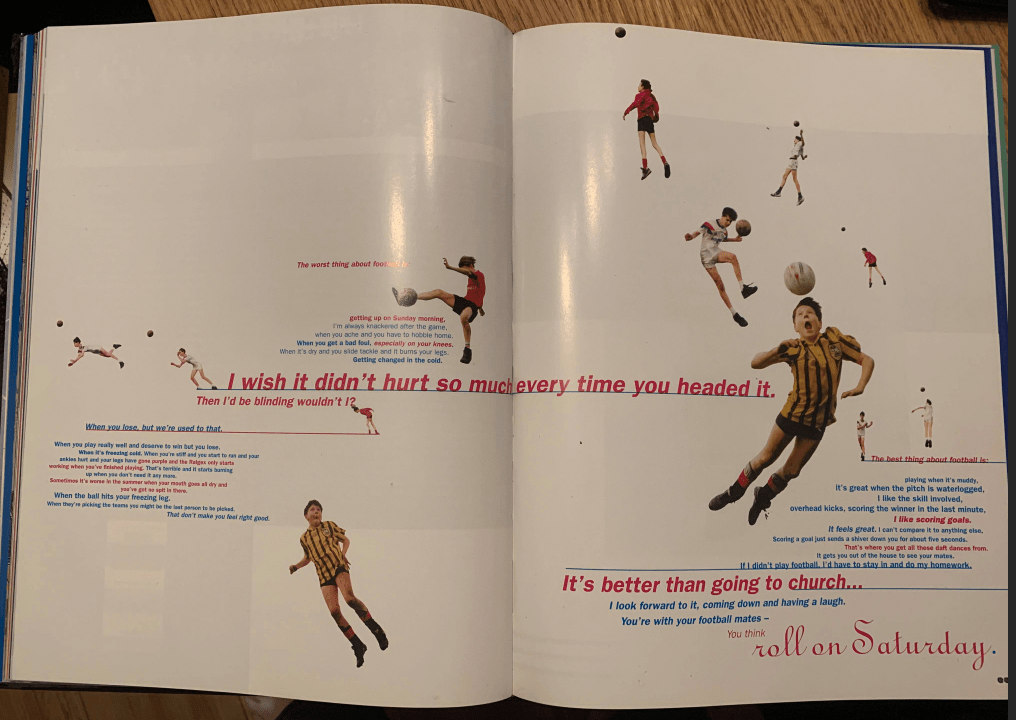 Upon further research of Soccer in Wonderland, figure1 appears to be illustrative of a socially engaged approach by encompassing a simple question ‘The worst thing about football is?’ Followed by a collection of short qualitative responses. This may have been collected by a questionnaire or focus group and offers an interesting dimension to the book, this approach may also may be applied to my own project. Collecting responses by participants, possibly asking open questions using social media or a workshop which could provide a deeper engagement with the project. Adding a socially engaged element is an approach that really appeals to me, having previously researched Emma Case and her project ‘Red’ which is a useful example encompassing the objective of creating an archive, although that would be far too extensive for my own project. Helguera (2011) cites Emilia ‘to participate is not to create homogeneity; to participate is to generate vitality’. In encompassing a collection of quotes/thoughts of others I suspect would yield some interesting results and add a nostalgic dimension to the project whilst taking the work away from my own person vision but at the same time provide anchorage to my work. When observing the pages in figure 1 my personal engagement is positive and enables the audience to identify with the work on a universal level. Inroads will be made into this approach and I will look to exploit further.